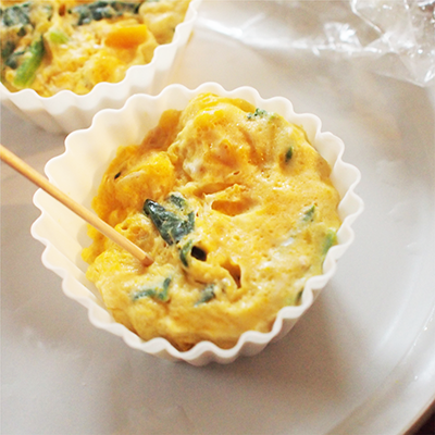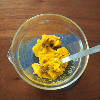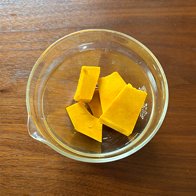 かぼちゃの皮と種を取り、耐熱容器に入る大きさに切る。ふんわりラップをかけて電子レンジ(600W)で2分程加熱する。