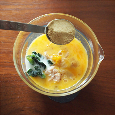 同じボウルに、溶いたたまご、ツナ、冷凍ほうれん草、米ぬかチャージを入れてかき混ぜる。