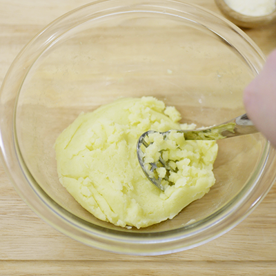 ラップを外して1分ほど蒸気を逃したら、しっかり潰す。(ゆるければレンジ加熱を10〜20秒追加する。) -
