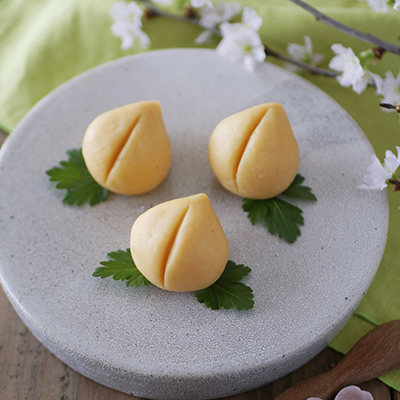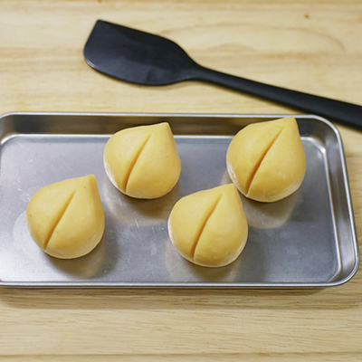 成形&盛り付け、4等分にして丸め、桃形+縦スジ1本。