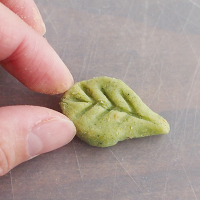 緑の生地の両端をつまみ、葉っぱの形に。ナイフで柄を描く。