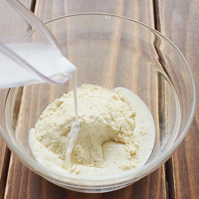 おやきミックスと牛乳をボウルに入れ、ダマがなくなるまで混ぜ合わせる。
