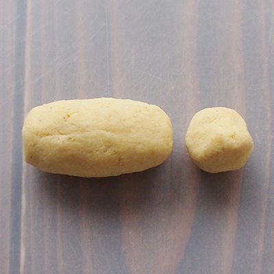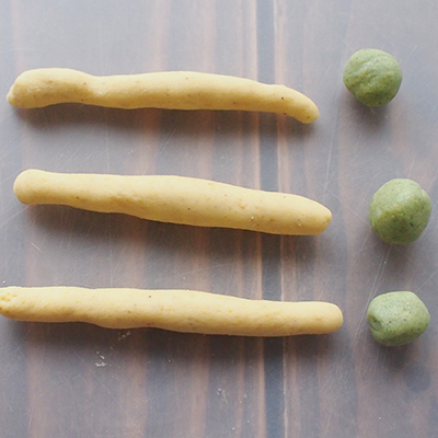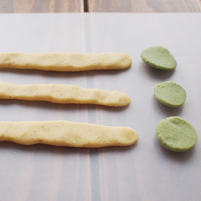 生地をそれぞれ3等分に分け、プレーン生地を棒状に伸ばす。