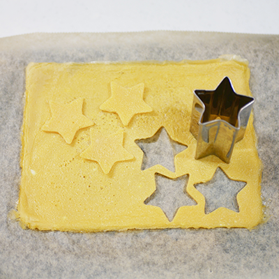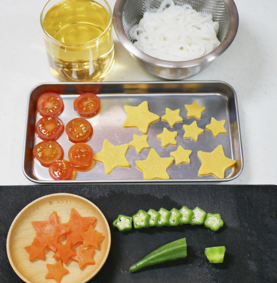 • 麺を茹でている間に、薄焼きたまごを作る。にんじんと薄焼きたまごは星の型で抜き、ミニトマトはスライスする。