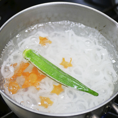 • 茹で時間が残り2〜3分になったらにんじんとオクラを加え、麺と一緒に茹でる。茹で上がったオクラは輪切りにする。
