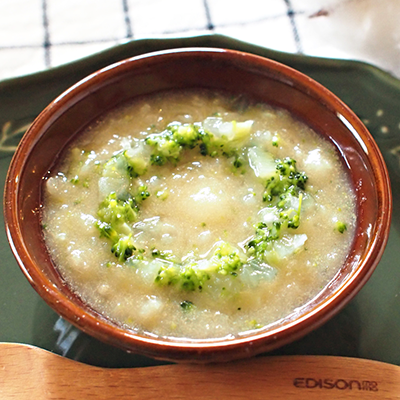 具材が柔らかくなったら、茹で汁と具材を分ける。玉ねぎとブロッコリーをみじん切りに。じゃがいもはフォークなどでマッシュする。