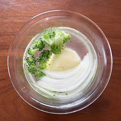 じゃがいも・玉ねぎ・ブロッコリーの穂先を耐熱容器に入れ、たっぷりの水を入れふんわりラップし、電子レンジ(600W)で2分加熱する。