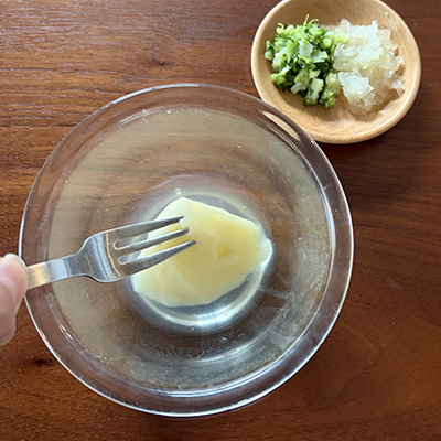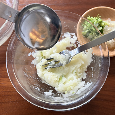 茹で汁を少しずつ加えながら、お好みのとろみになるまで混ぜる。