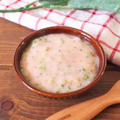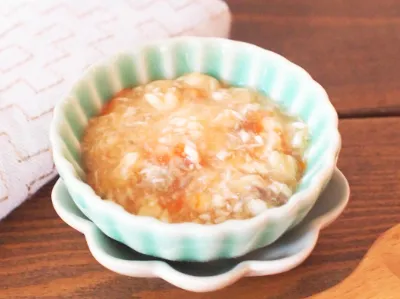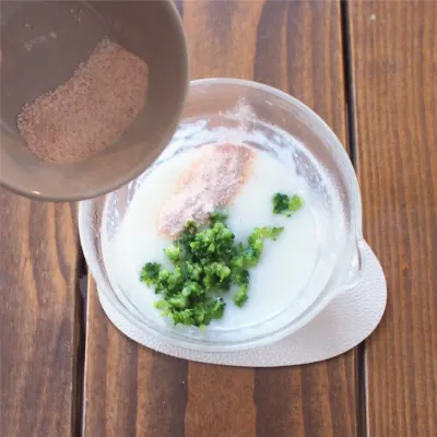 軽く汁気を切った7倍粥に牛乳を加え、ラップをし、電子レンジ(600W)20秒加熱する。