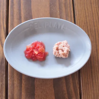 ツナの水煮缶の汁気をきる。プチトマトの薄皮を剥き、タネを取り、どちらも細かくみじん切りにする。