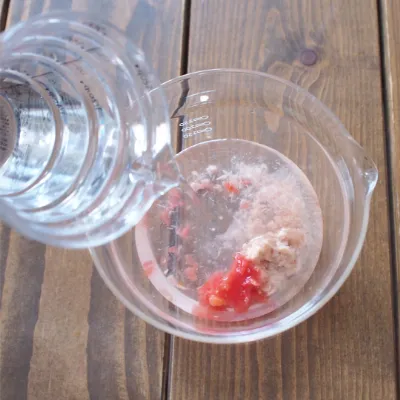 耐熱容器にプチトマトとツナ、水を入れ、ラップをし電子レンジ(600W)で1分半加熱する。