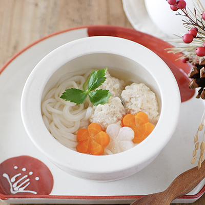 彩りも豊かで栄養満点な赤ちゃんお雑煮の完成!お餅の代わりに食べやすいリング型のうどんを使用しているので小さなお子様もお正月気分を楽しめます。簡単なので、是非つくってみてください♪