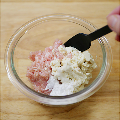 ひき肉は粘りが出るまで混ぜ、水切りした木綿豆腐・調味料・片栗粉を加え、よく混ぜ合わせる。 -