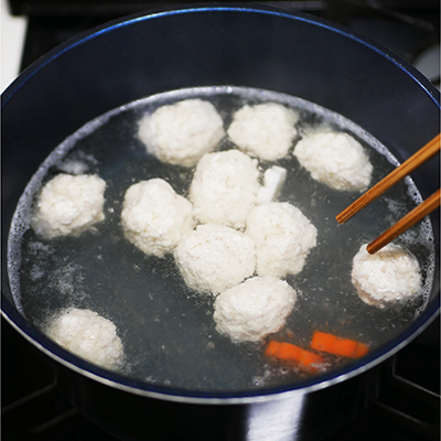 沸騰させたお湯の中にスプーンですくった鶏団子を落とし、にんじん・大根と一緒に中弱火で5分ほど煮る。