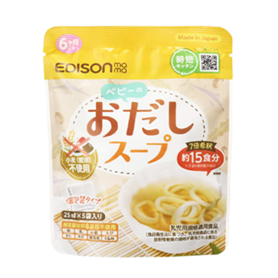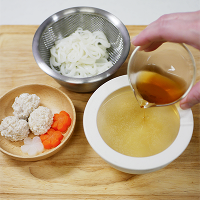 お雑煮用に、鶏団子を茹でた汁 150〜200ml程度を器に移す。ベビーのおだしスープを加え、お汁を作る。